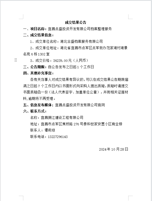 宜昌點(diǎn)盛投資開發(fā)有限公司檔案整理服務(wù)成交公告
