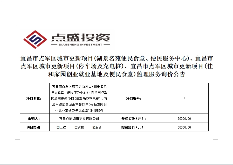 宜昌市點(diǎn)軍區(qū)城市更新項(xiàng)目(湖景名苑便民食堂、便民服務(wù)中心)、宜昌市點(diǎn)軍區(qū)城市更新項(xiàng)目(停車場(chǎng)及充電樁)、宜昌市點(diǎn)軍區(qū)城市更新項(xiàng)目(佳和家園創(chuàng)業(yè)就業(yè)基地及便民食堂)監(jiān)理服務(wù)詢價(jià)公告