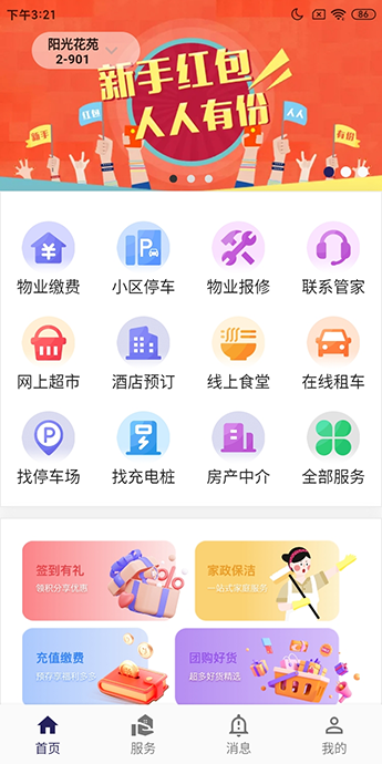 包括物業(yè)繳費(fèi)、小區(qū)停車、物業(yè)報(bào)修、意見反饋、樓棟管家、賬單查詢、訪客邀請、家政清潔、養(yǎng)老護(hù)理、寵物代養(yǎng)等功能。